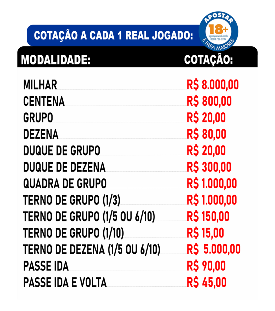 SEGUE NOSSA TABELA DE VALORES A CADA r$ 1,00 JOGADO.